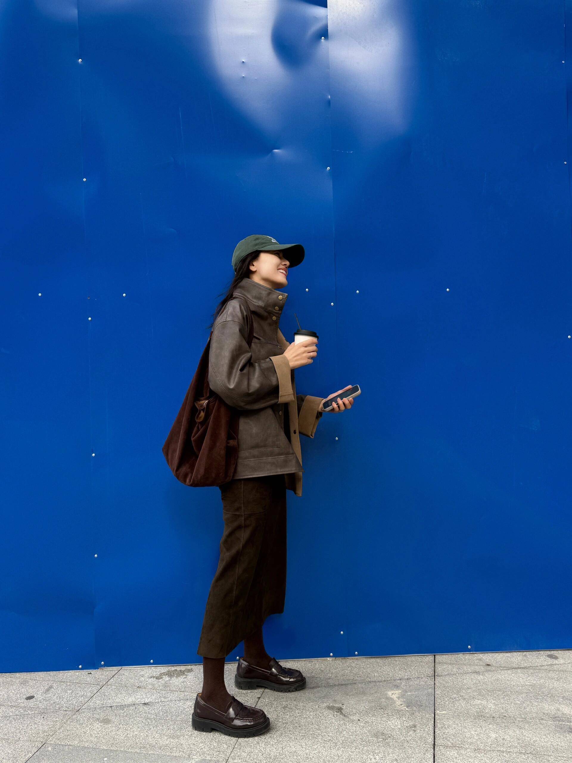 这套同样如此,摩卡棕皮衣搭配棕色麂皮半裙,绿色棒球帽搭配棕色,是复古时髦的大地色系搭配典范。