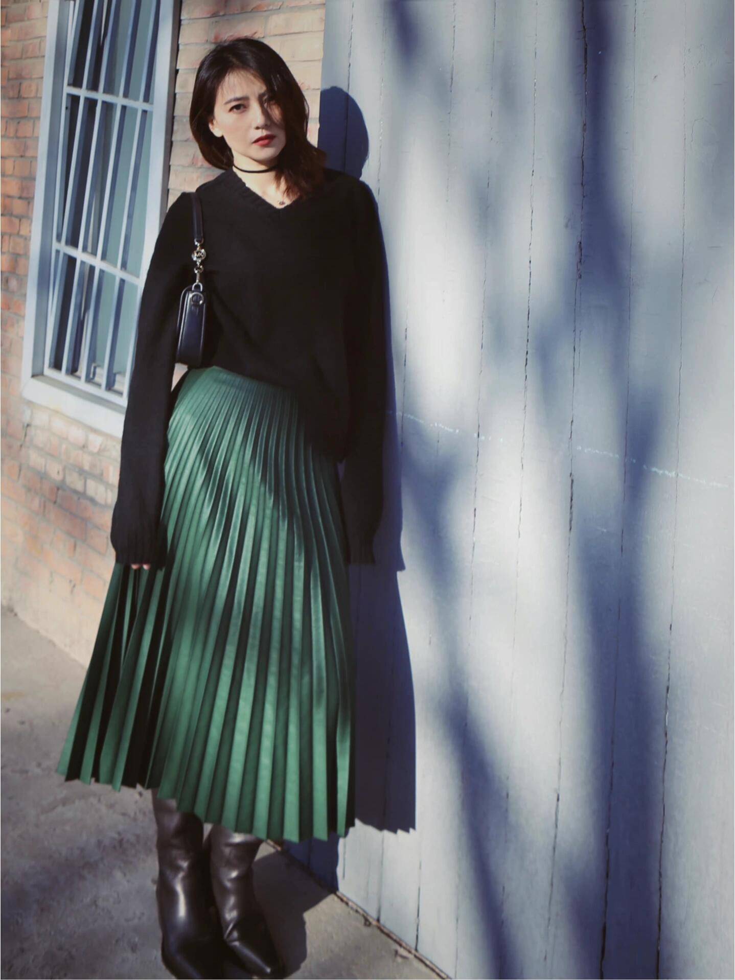 喜欢酷范的姐妹,可选择黑色长皮衣搭配百褶半裙,潇洒自信,这个绿色挎包很实用,高圆圆很多穿搭中都搭配了这个包。