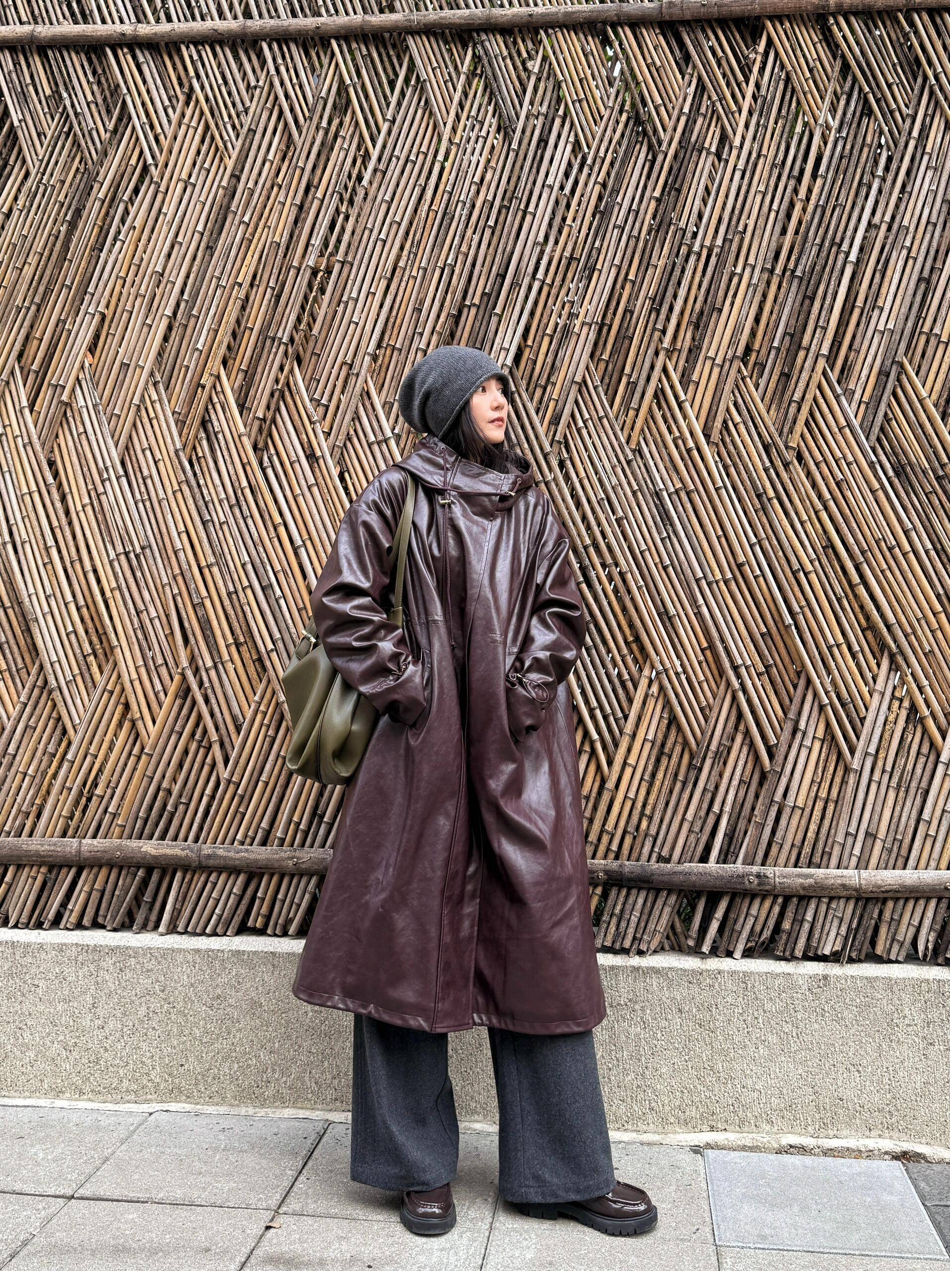 即便要穿出亮色感,也选择低饱和颜色,比如这件棕红色的皮大衣,搭配黑色羊毛裤,再配上咸菜绿的单肩包,撞色搭配抢眼却不浮夸。