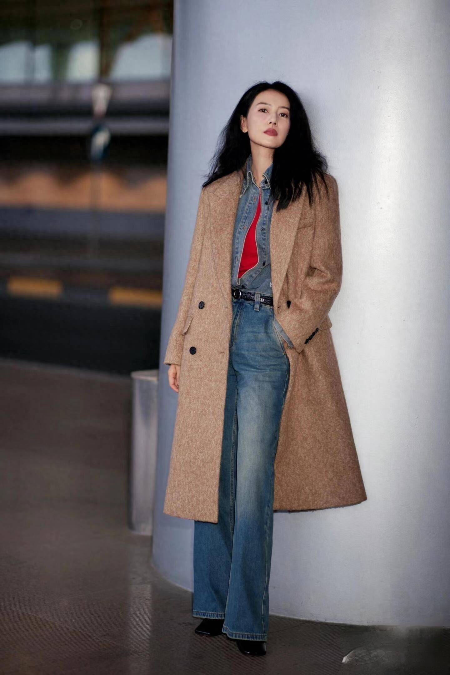 大衣若想穿出高级感,可像高圆圆这样,内搭选择高质感的衬衣配牛仔直筒裤,若觉得冷,叠搭羽绒马甲或者毛衣也很不错。