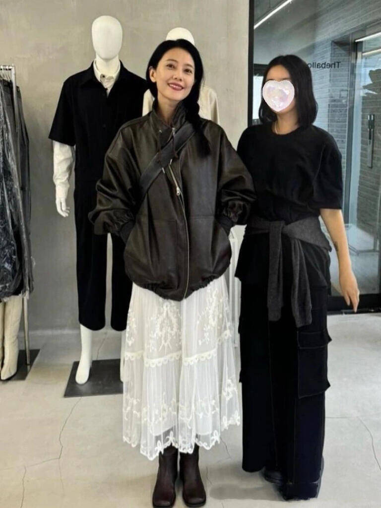 高圆圆的皮衣搭配多样,这种加绒内里的款式保暖又时髦,搭配轻盈的半身裙,显得落落大方。